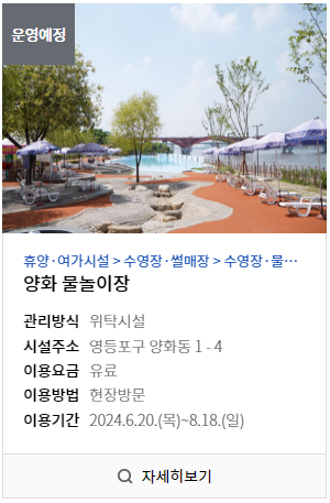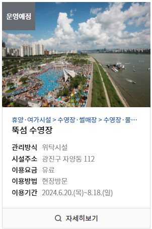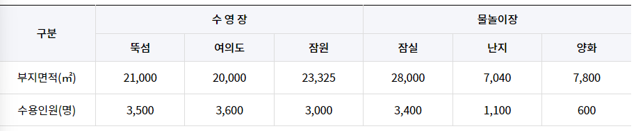 | 이용장소 | 뚝섬, 여의도, 잠원 야외수영장 / 잠실 난지, 양화 물놀이장 |