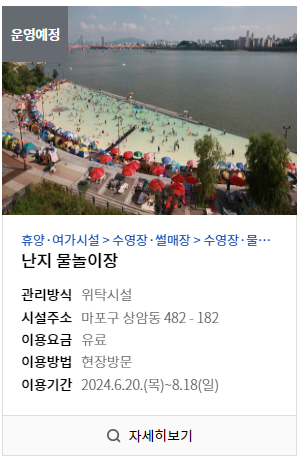 - 폭우로 침수 시 수영장 운영이 일시 중단될 수 있으므로 폭우 시 공지사항을 확인하시거나 각 수영장 및 물놀이장으로 문의하여 주시기 바랍니다.
