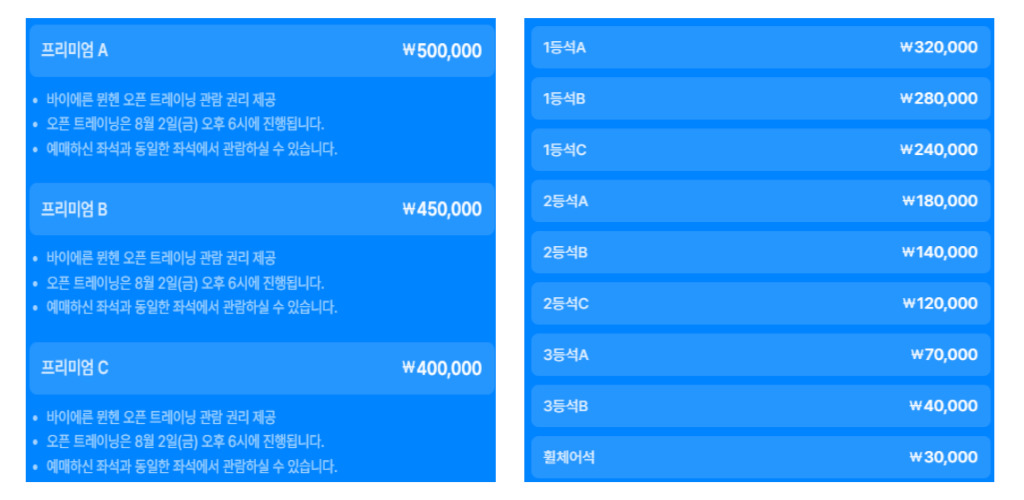 - 오픈 트레이닝 전 좌석은 지정좌석제이며, 본 경기 프리미엄 A~C 좌석 구매자에게는 오픈 트레이닝 관람 혜택이 제공됩니다.